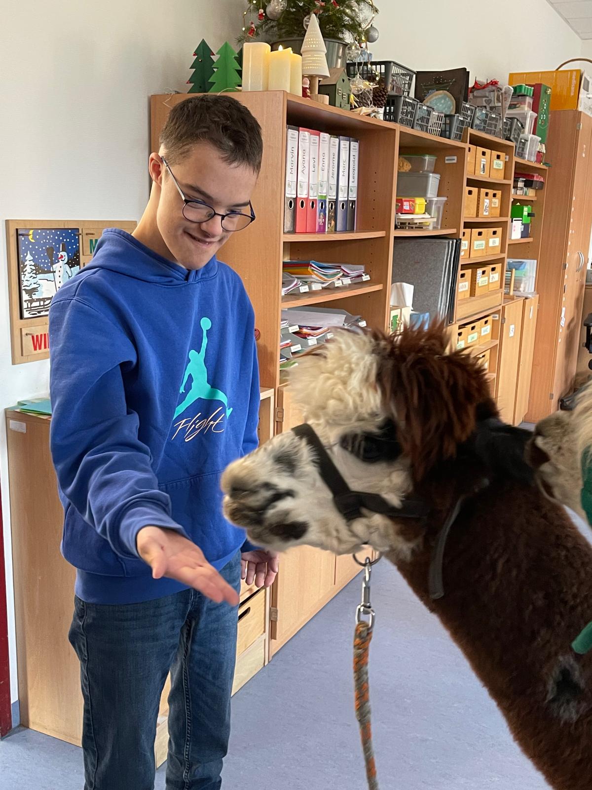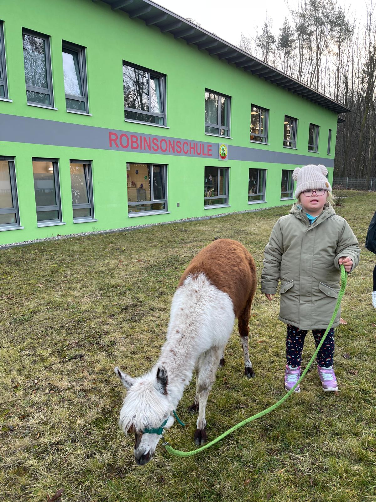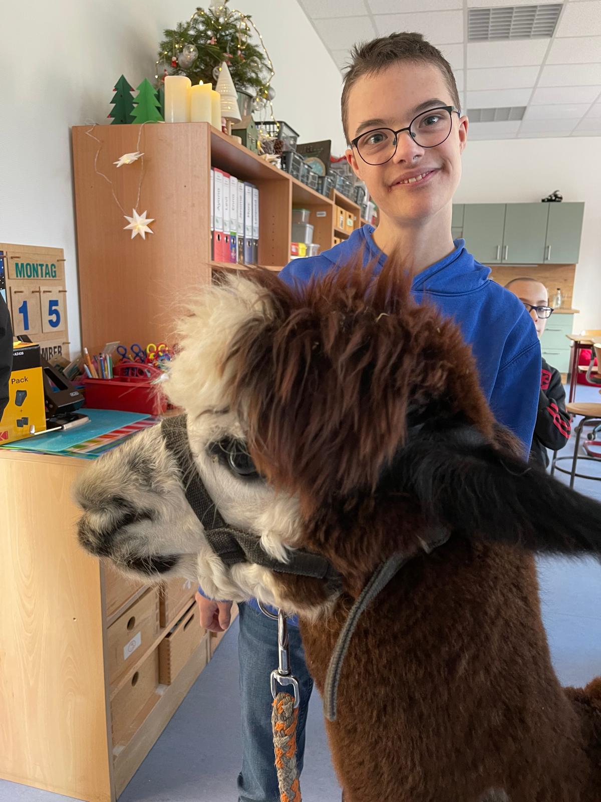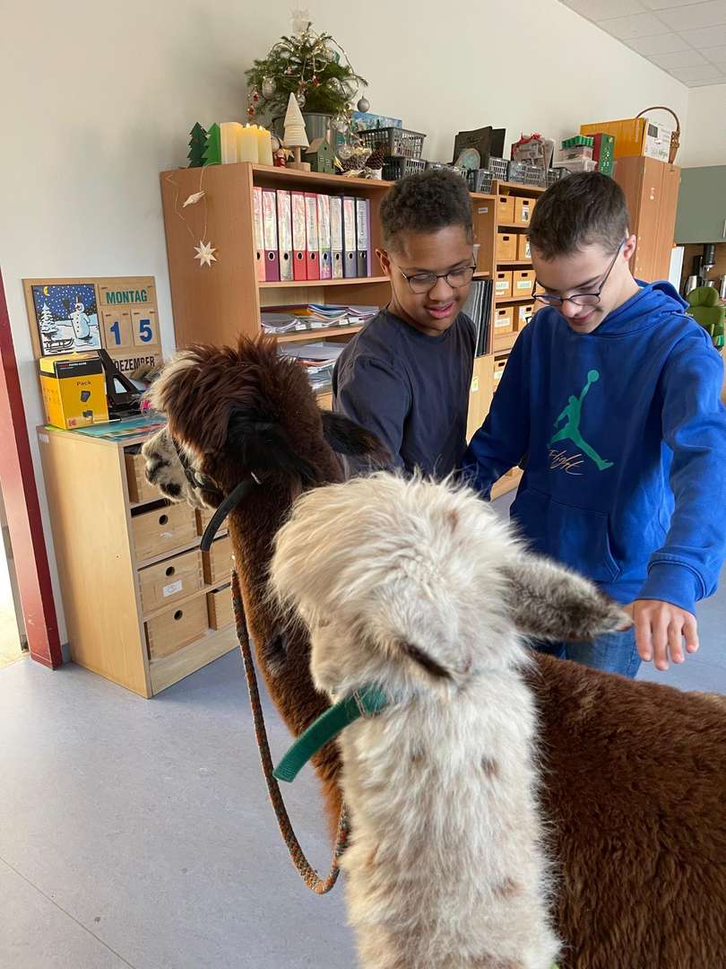 Unser Plan ist, dass die beiden jetzt öfter zu uns kommen und so alle unsere Schülerinnen und Schüler nach und nach in den Genuss kommen einmal Zeit mit den Alpakas zu verbringen. ;)